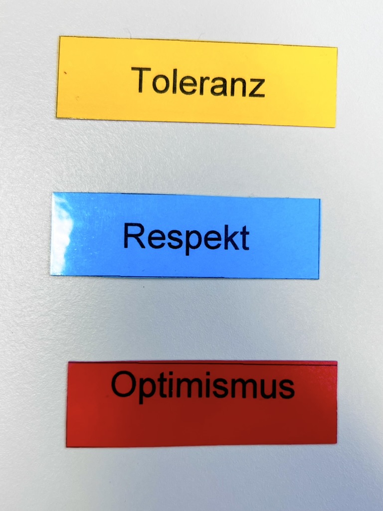 Bei einer Übung mussten wir intuitiv Kärtchen ziehen und diese mit einem Partner diskutieren. Meine gezogenen Karten ergeben einen neuen ORT und sollen das repräsentieren, was für mich wichtig ist: Optimismus, Respekt und Toleranz.